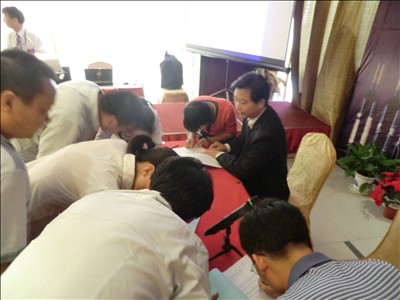 签约台前一如既往的火爆拥挤。由于公司提供了实惠的现场签约奖励政策,客商们跃跃欲试要争做前三名签约者,获得更优厚的现场奖励。