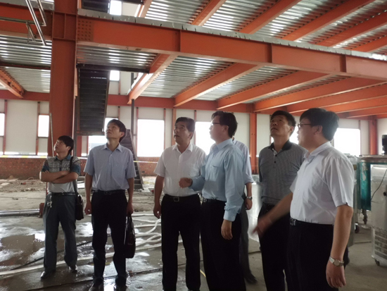 高董事长为周主任(左三)介绍了东方紫酒厂建设进展情况,正在修建的紫酒厂为万吨级酒厂,是世界上设备最先进,产量最大的紫酒厂。