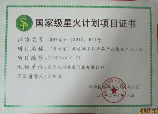2012年10月18日,公司荣获国家科学技术部星火计划办公室颁发的“国家级星火计划项目证书”。批准文号:国科发计[2012]611号 ;项目名称:“东方紫”桑椹酒系列产品产业化生产与示范;项目编号:2012GA690171 ;