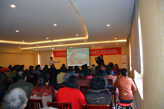 2014年年度句容市农业职业技能桑椹种植专业(园艺工)培训班在东方紫厂区会议室成功举办,此次培训有桑果种植基地100多位种植户参加,由中国农业科学院博士生导师吴福安现场讲解指导;基地农户们踊跃学习桑椹种植知识。