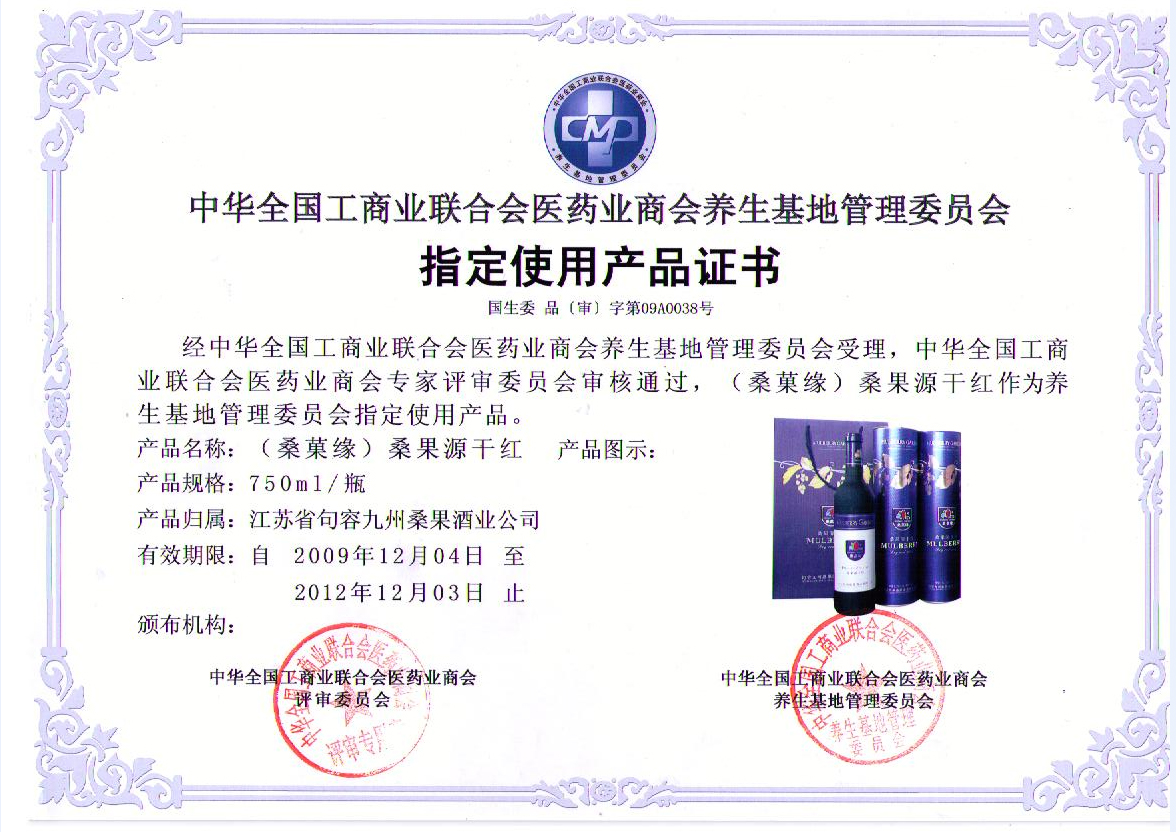 中华全国工商业联合会医药业商会养生基地管理委员会指定使用产品证书