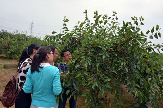 [东方紫酒研发中心主任黄教授带领中心工作人员了解桑果成长情况]