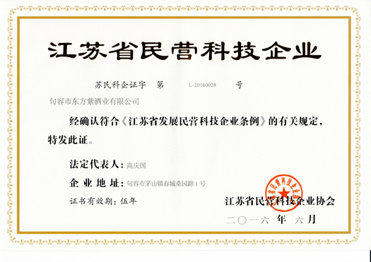句容市东方紫酒业有限公司获得“江苏省民营科技企业”称号