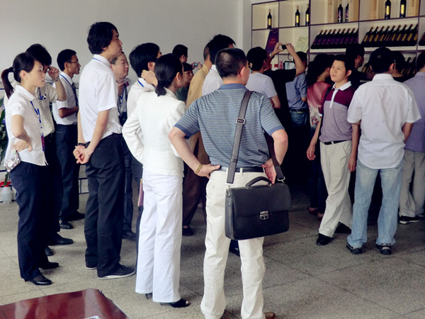公司领导陪同经销商参观厂区产品陈列室。随着东方紫与中国农业大学葡萄酒科技发展中心合作的东方紫酒研发中心的成立,这间陈列室中的产品将会增加到包括现有产品在内的,以及以全新酿制手段和配方制成的几十款新产品。