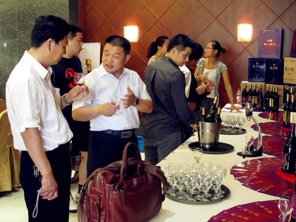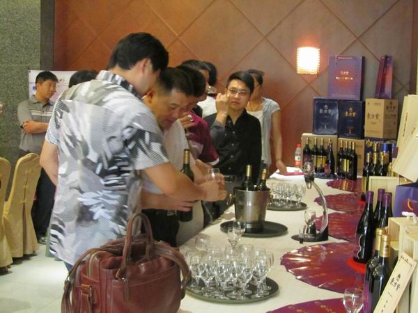 [图为仪式开始前,经销商在会场,品尝经过正确降温和醒酒的各种东方紫美酒。]