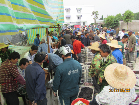 大家一边耐心的等待,一边谈论着东方紫对农户的支持补助、今年的收入,比较着各自的收成和成色。在这里,有开着运输车前来的、有骑着电动三轮车前来的、甚至还有挑着担子前来的农户。