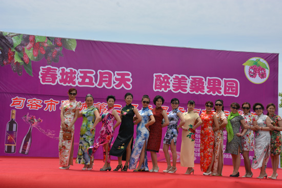 5月16日,中国旗袍会挑战最多人同时穿旗袍“世界吉尼斯旗袍秀”活动在此间举行。活动旨在弘扬和发展中华民族传统文化,让全世界了解欣赏东方女性婉约之美,了解中华旗袍文化的博大精深。图为在5月16日举办的第二届“句容春城桑果紫酒节”开幕式现场的美女展示各色旗袍。