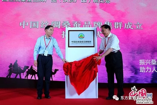 中国品牌集群联席会主席葛志荣和中国丝绸桑蚕品牌集群主席、原农业部党组成员、中央纪委驻原农业部纪检组组长朱保成为中国丝绸桑蚕品牌集群揭牌
